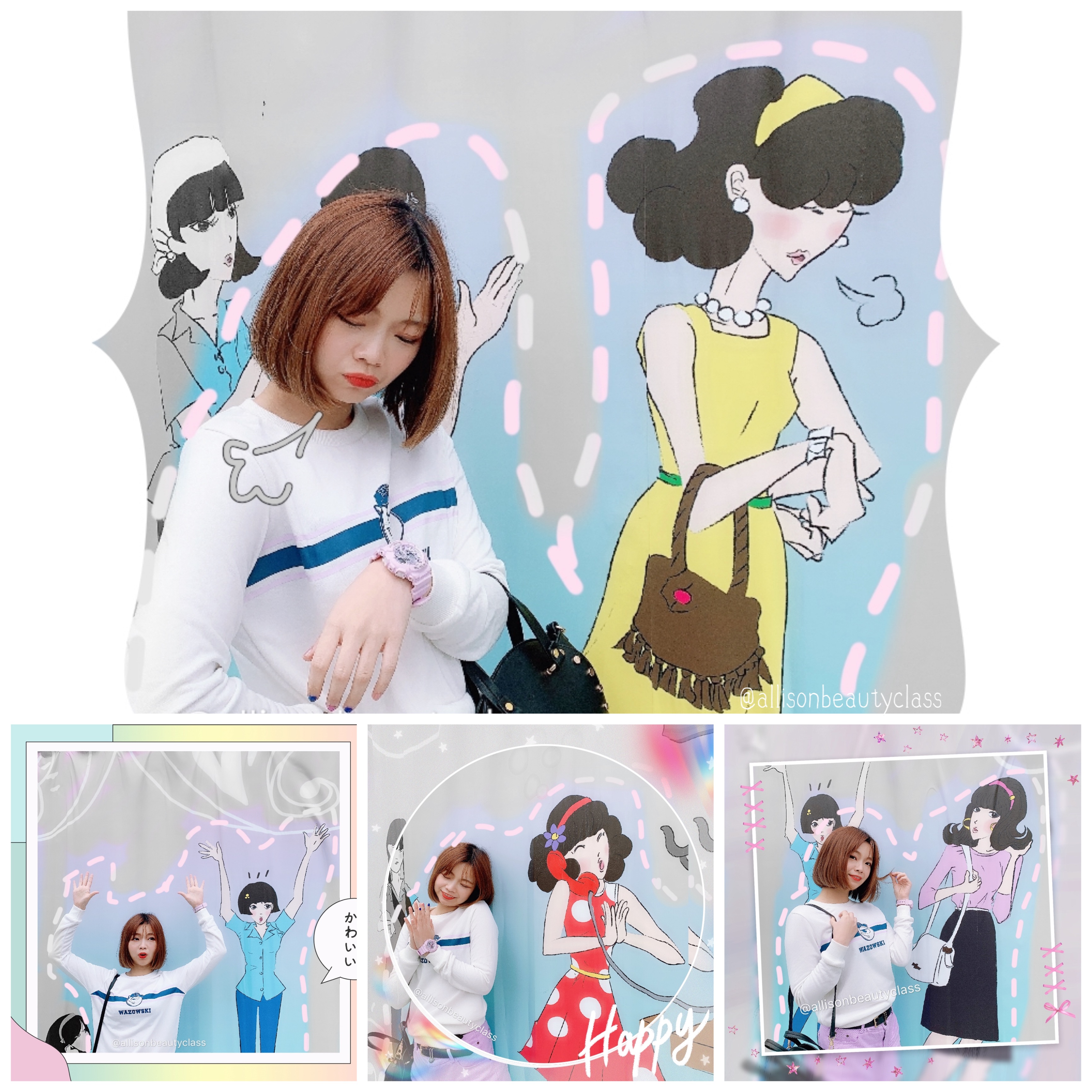 外牆有一區可愛插畫,訴說著園區的由來,原來這裡以前是台塑企業的女子宿舍阿~牆上的排隊打電話情境復古可愛,充滿童趣感的插畫,很適合拍互動照,之前38婦女節我拍的這組照片就是在這裡拍的啦~哈哈