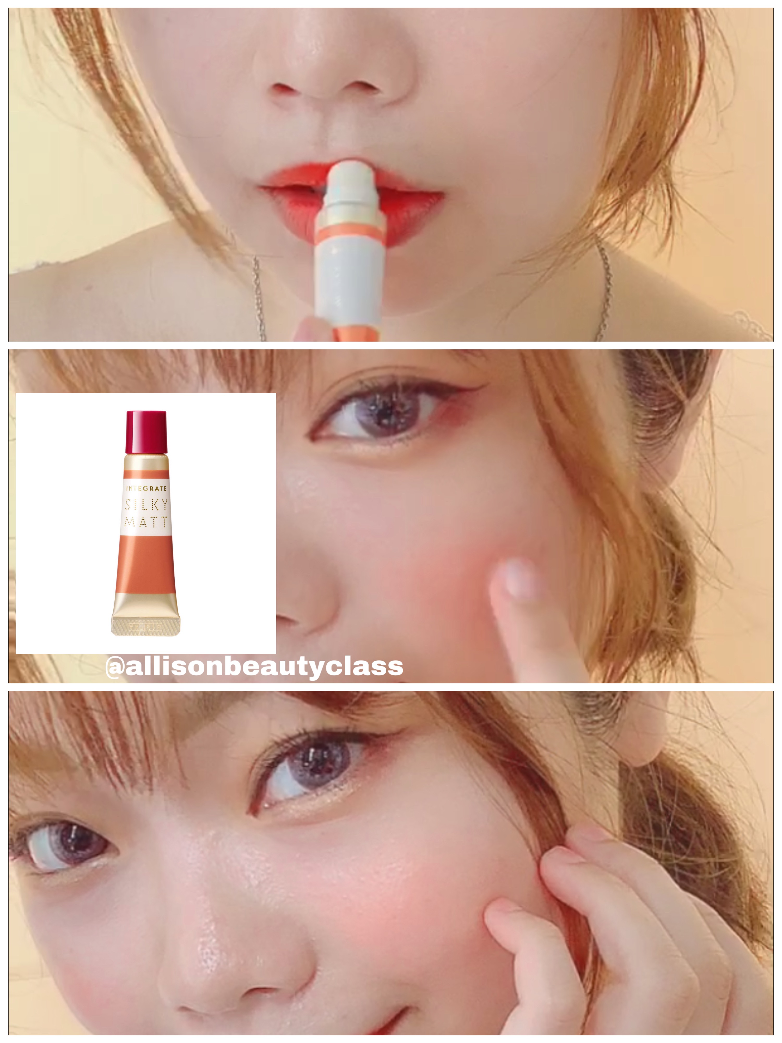 外拍照的妝容,顏色最重的部分就是腮紅/修容/唇妝,今天用一支搞定! Integrate Silky Matt Lip 金緻光柔霧唇頰彩 #OR481 鮮橘色,非常顯色,用量只要一點點就好喔!