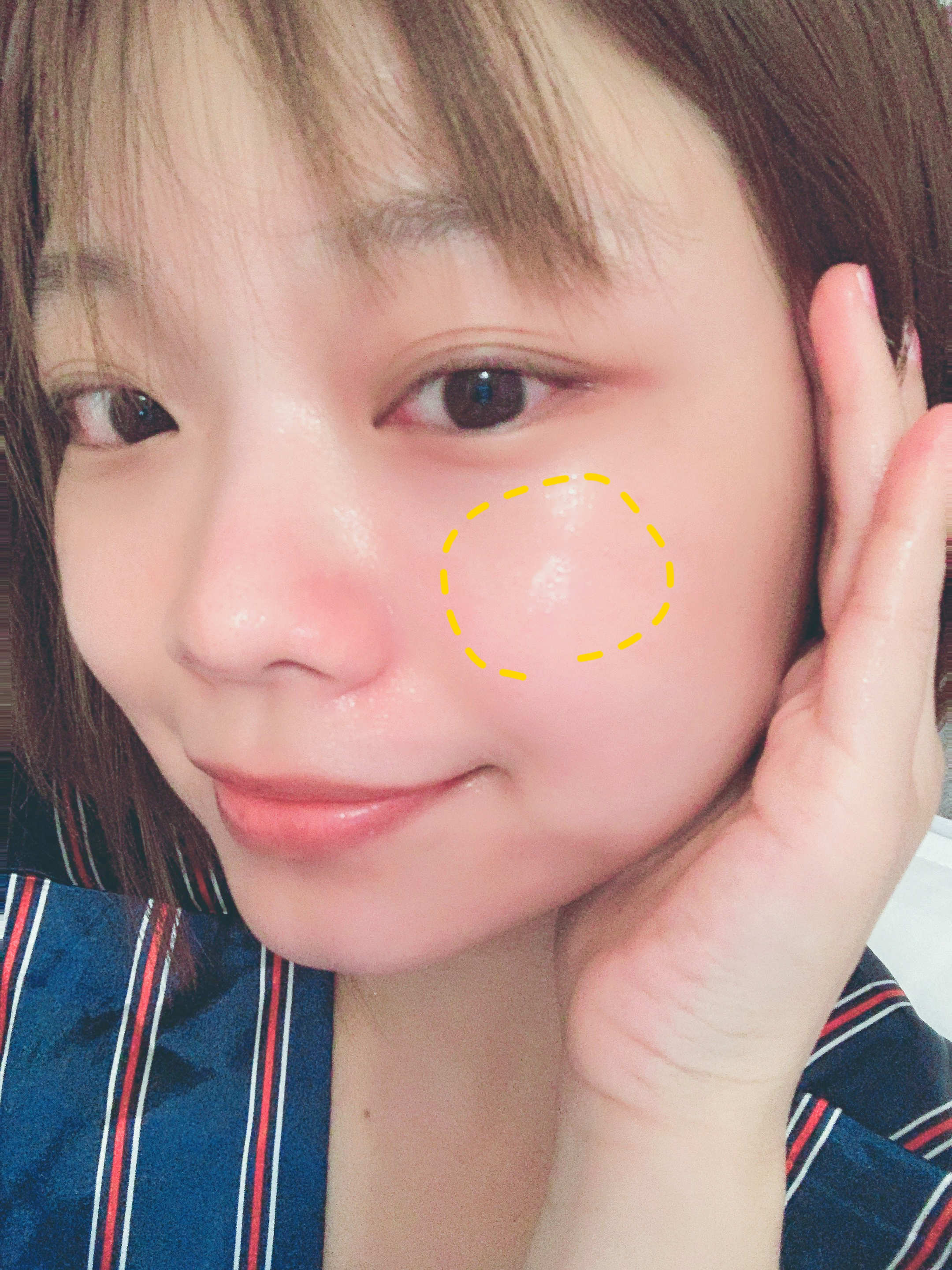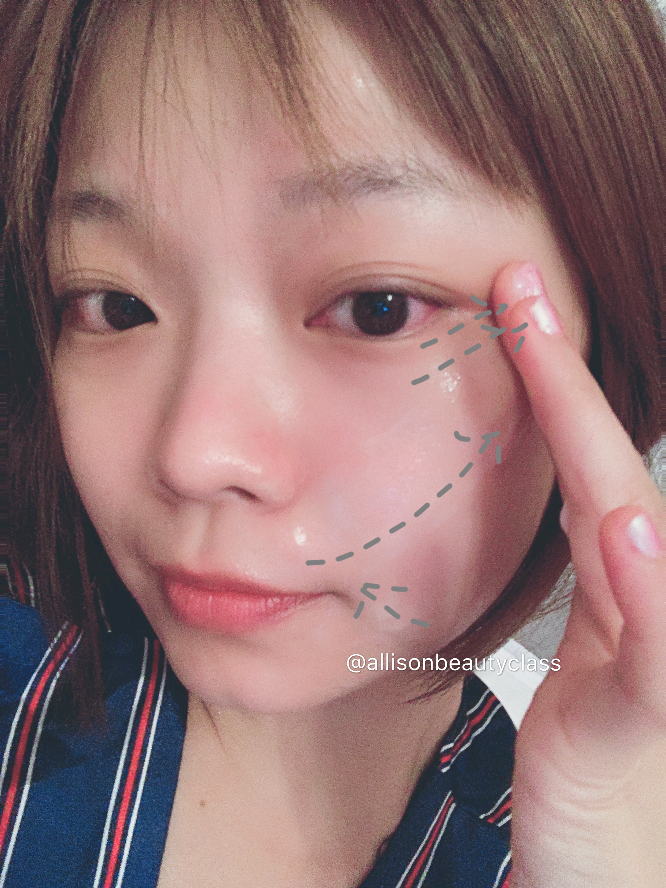 手上剩餘的量再往臉頰塗抹,一樣是從中央往旁邊跟上方的方向,好好的擦完保養品,蘋果肌這邊應該是發亮的!