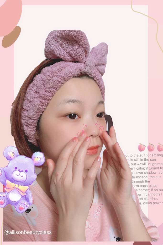 接著進入到實際臉部示範囉!我通常會從鼻翼開始,畫圈按摩再帶到鼻頭,畢竟鼻頭粉刺是最讓人苦惱的阿~