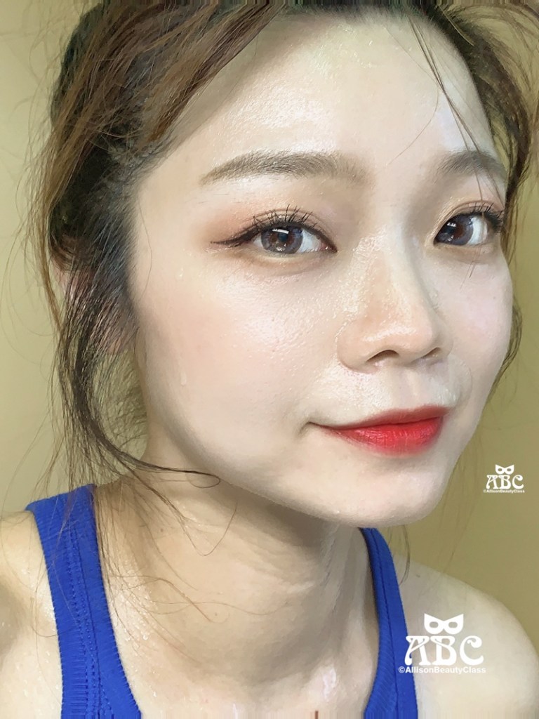 那麼,運動完大爆汗之後呢?汗珠都還在我臉上,但妝沒有融化,眼週附近也還好,只有眼下一點點暈染,這個程度算是很OK了,這就是有用蜜粉在眼周加強定妝的效果,這時候優雅地用面紙把汗壓掉,就恢復你的美貌了!(記得用面紙輕"壓"的方式把汗水吸掉,不要用左右擦拭,會把原本好好的妝毀了的)