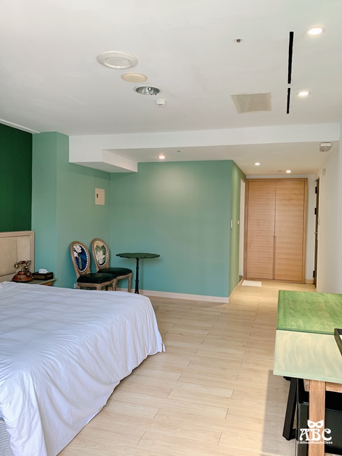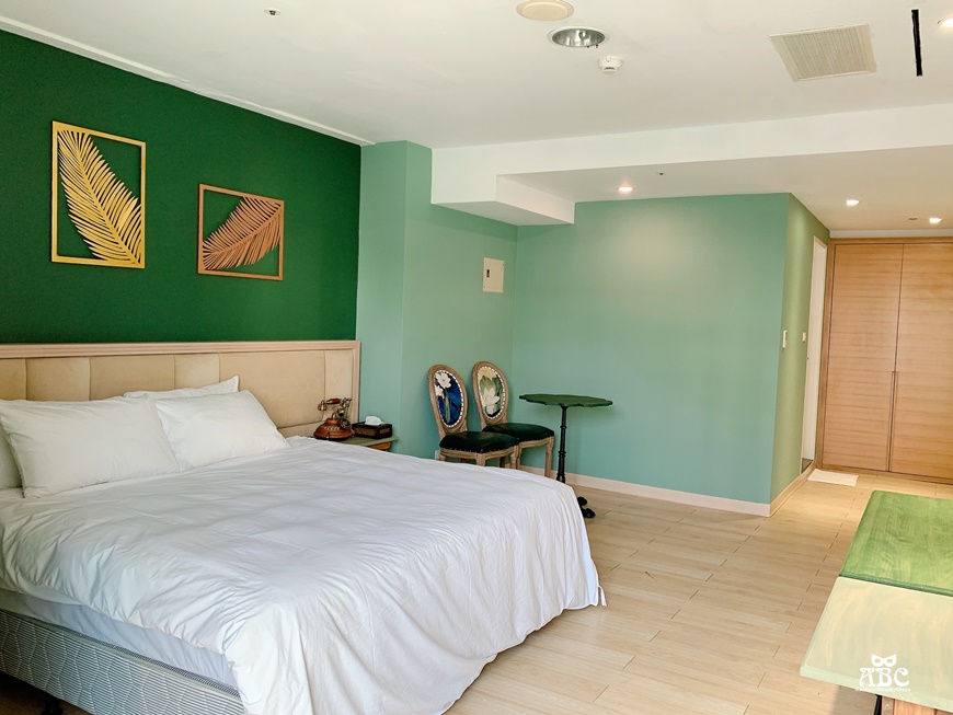 整體色系是舒服的蒂芬妮綠牆面,搭配溫馨原木色地板、衣櫥,