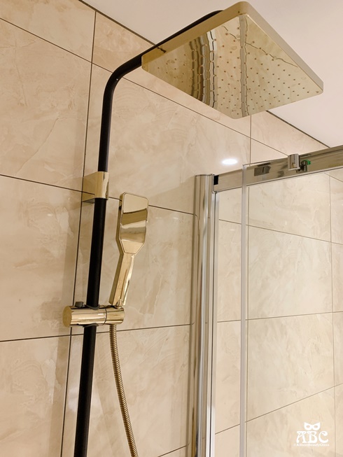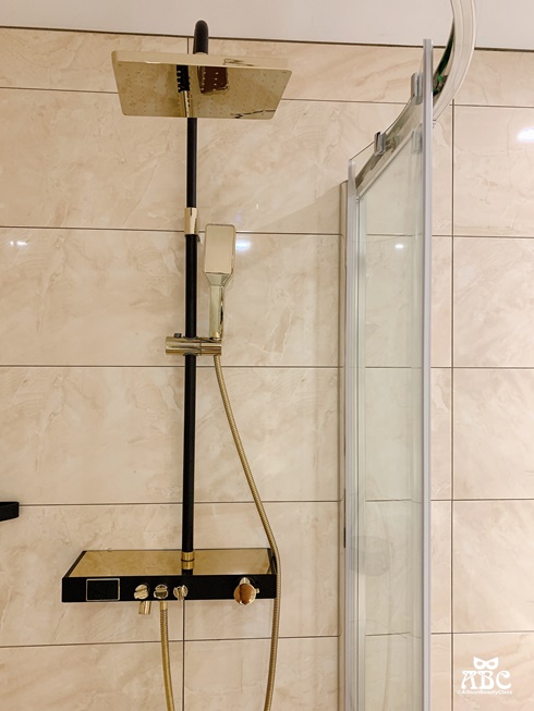 這個沖澡的花灑設計很特別,是用按鈕可以微調溫度的!