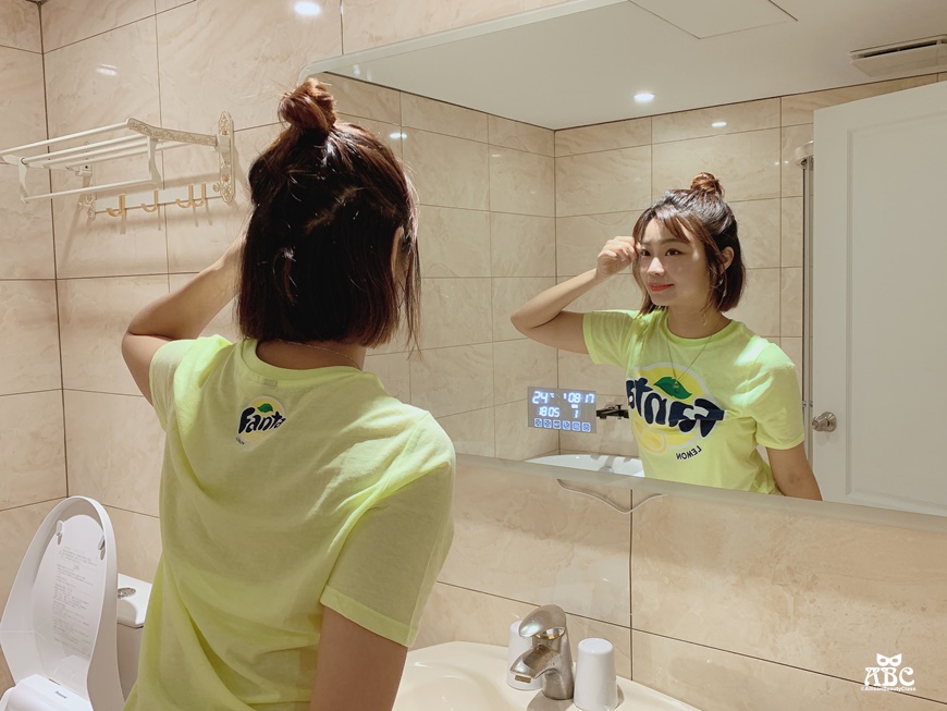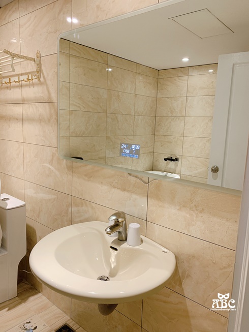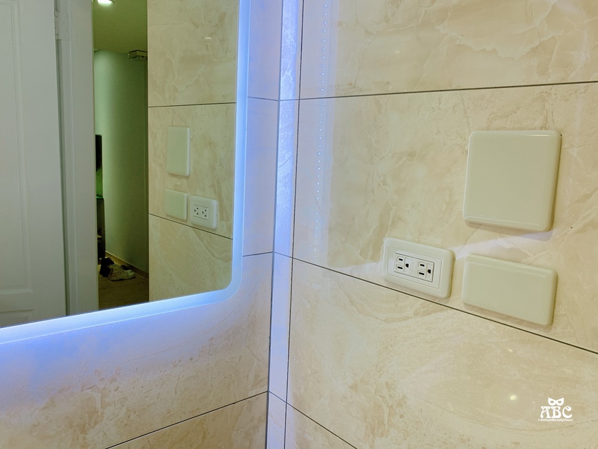 還有一個很貼心的地方,鏡子旁邊有插座,我們在鏡子前吹頭髮或是用電棒捲都很方便!