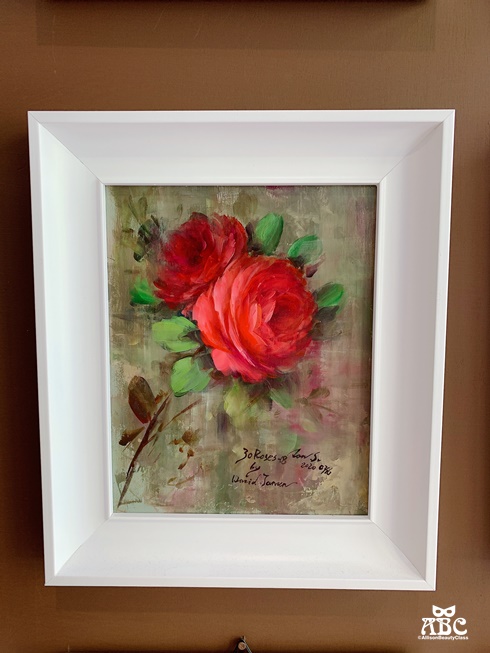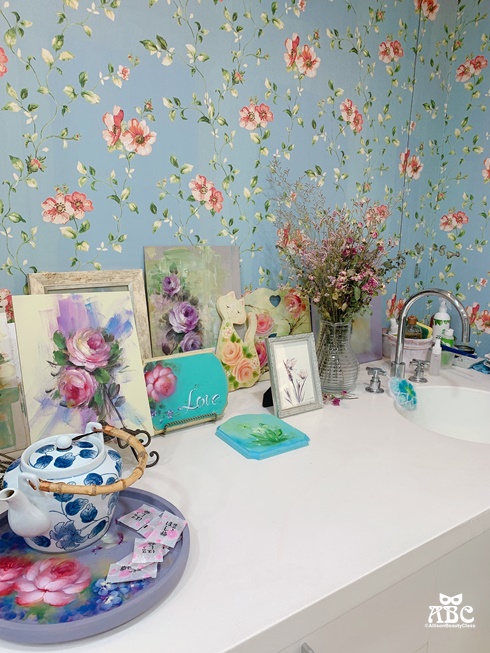 牆上的花卉紋壁紙與立體玫瑰裝飾,呼應著展示的彩繪玫瑰作品,