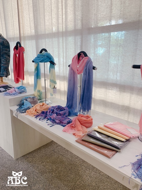 各種柔美色彩的絲巾、圍巾垂掛在一起,色彩很多卻很協調,賞心悅目!
