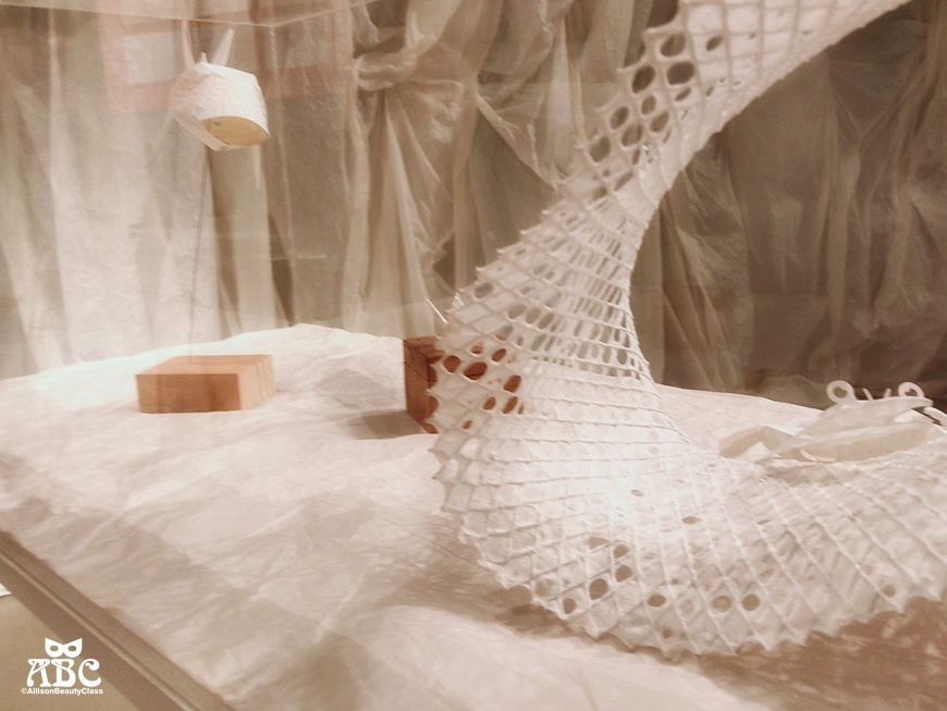 下面這件作品是最讓我印象深刻,最驚豔的!「紙・裳」,可以泡在水耶!。巨大的圓圈光環框住魚缸,走近看可看見水中緩慢飄動的紙紗,原來還有可以泡在水中不會壞的紙質,