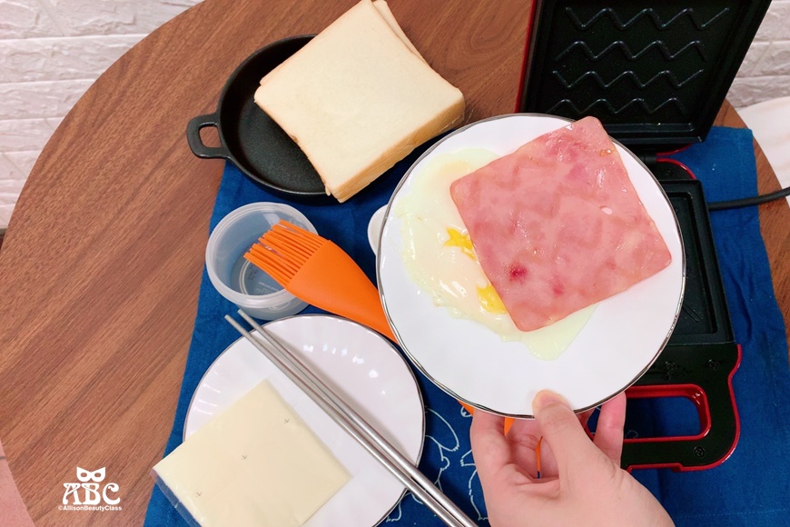- 依序放上吐司、火腿、起司、蛋、吐司,蓋起來等4分鐘,打開完成!