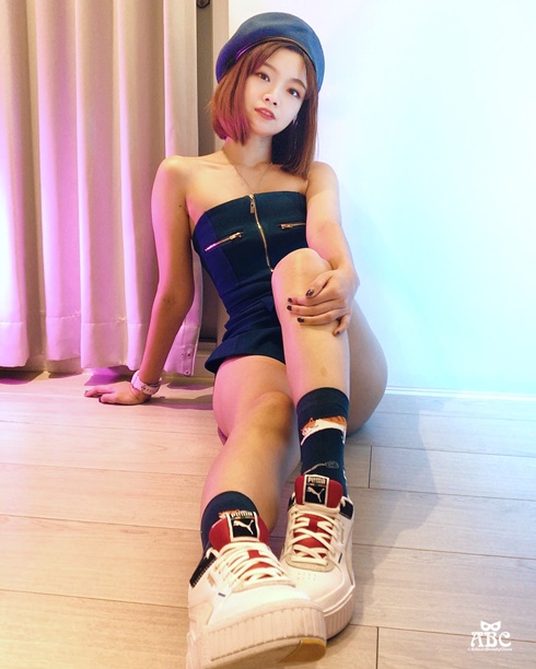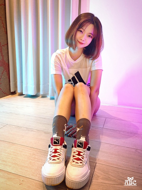 上身是比較辛辣風格,腳上穿著同色調但是有著可愛貓咪的襪子,