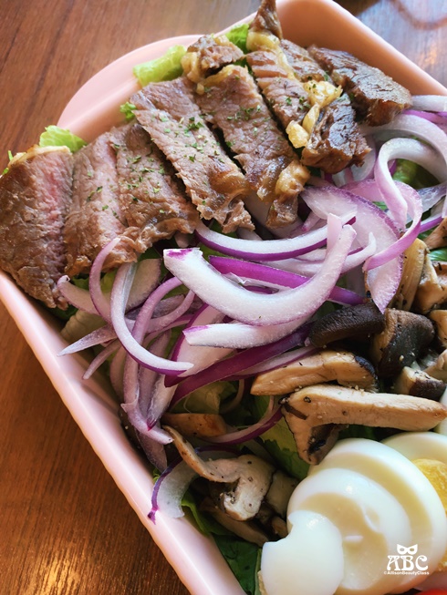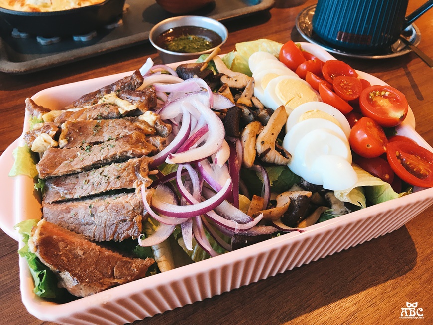 沙朗牛排搭配滿滿的鮮蔬,有小番茄、水煮蛋、炒香菇、洋蔥,