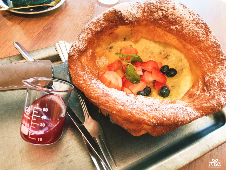 攝影師提醒我,要先淋醬啦!可愛的小量杯裝著特製莓果醬汁,