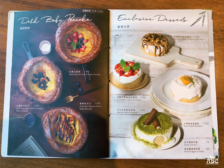 來到咖啡廳當然不能錯過甜點!甜點主要是鐵鍋鬆餅跟戚風蛋糕兩大類,有不同口味可選擇。