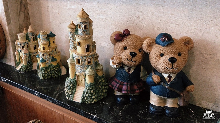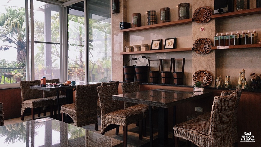 餐廳內大理石壁面與桌面,搭配藤編休閒椅,各種異國風情擺飾,佈置得很歐風。