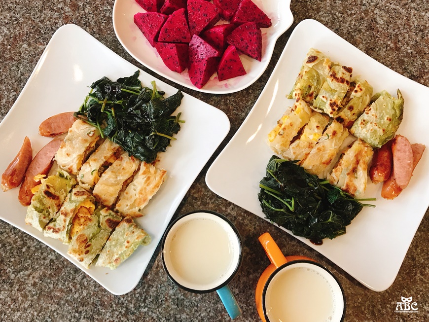 有雙色蛋餅、火腿、新鮮蔬菜、豆漿、水果,吃得很飽。