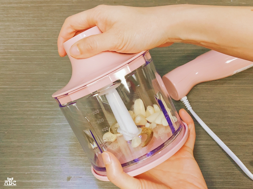 蓋上切碎器的蓋子轉緊,這邊要壓好轉緊喔!