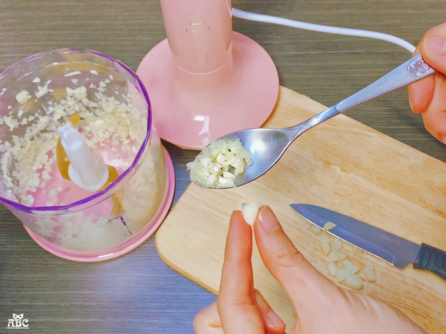 來對比一下我用手切的蒜粒,我才打一下就差這麼多!因為我想要保留一點大蒜的口感,不想太碎,但是也不能像我手切這麼大顆阿,這時候交給機器最方便!想要更細的話就在打久一點就好了。