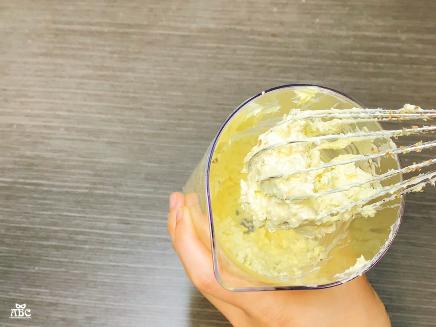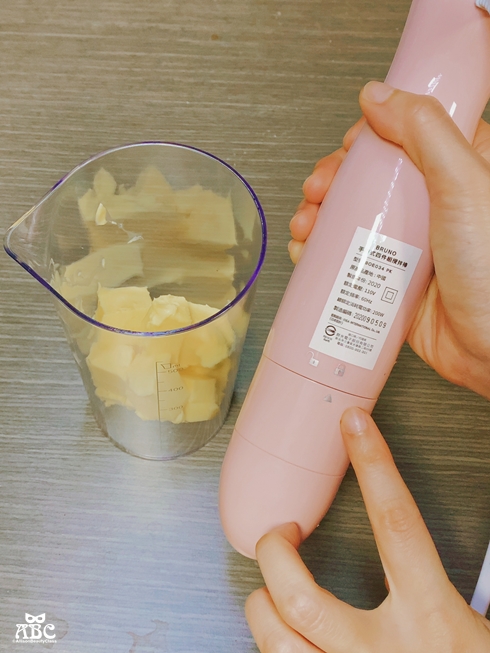 (2) 使用【BRUNO】手持式四件組攪拌棒的打蛋器,打到奶油變成有點泛白的樣子。