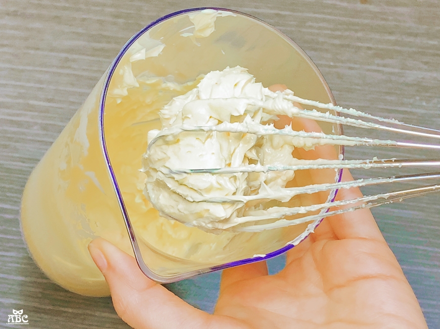 (2) 這邊是整個蛋糕的成敗關鍵,基本上這應該是零失敗的,除非你沒有好好看仔細喔!首先我們先把奶油乳酪放室溫稍微軟化之後,切塊用【BRUNO】手持式四件組攪拌棒的打蛋器打散,然後重點來了!!很多人會不懂什麼是打發?這時候我們倒進鮮奶油,建議底下可以墊一個保冷劑保冰劑(或者冰水盆),鮮奶油在低溫的狀態下會比較好打發喔!然後按壓開關之後,我們同時要把打蛋器來回去碰杯壁,像這個小口徑的量杯就比較容易打,打成像下圖拉起來彎鉤的狀態就可以了。接著加入糖,攪拌只要一下下有均勻就好。