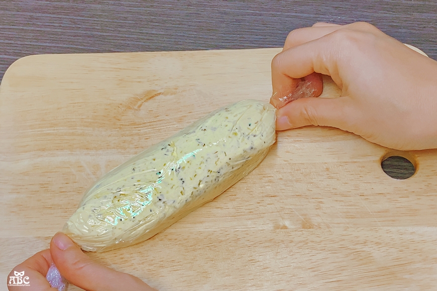 用保鮮膜把打好的抹醬包成這樣長條形狀,然後拿去冷凍,直到它變硬定型後,要用的時候就直接切來用就好了,是不是很方便!
