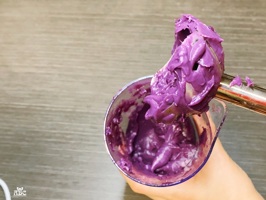 (2) 蒸熟並放涼的紫薯塊,依序加入糖、加熱成液狀的無鹽奶油、牛奶,分次用攪拌棒打勻,這個量杯大小剛好,攪拌棒也只要單手操作,一手拿量杯,一首按壓攪拌棒,按個幾下就完成了,超級簡單啊!