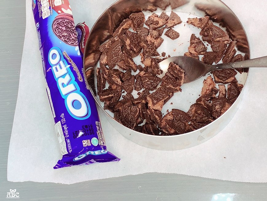 (1) Oreo餅乾一條全部用手掰成小塊,以前沒有機器都用湯匙壓,很浪費時間