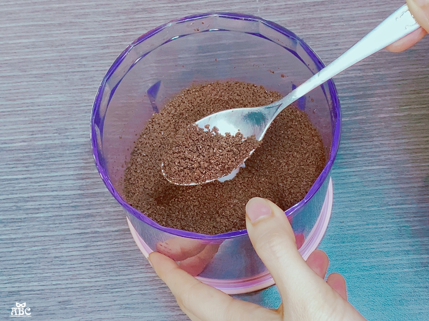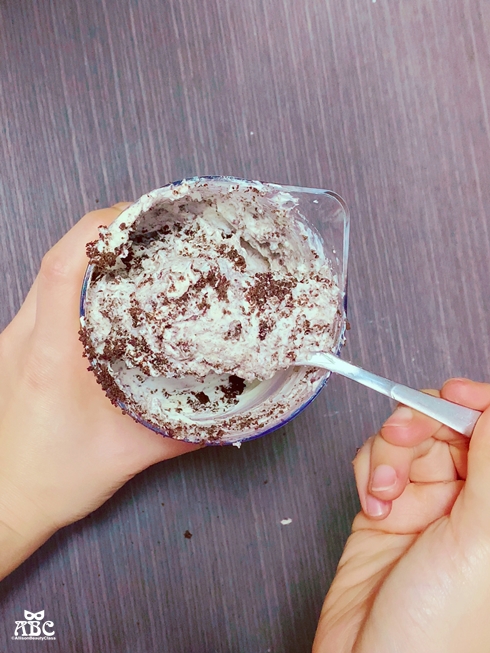 (3)接著把剛剛剩下1/3的餅乾屑分次加進來,用湯匙稍微拌勻一下就好。不要攪太久喔!