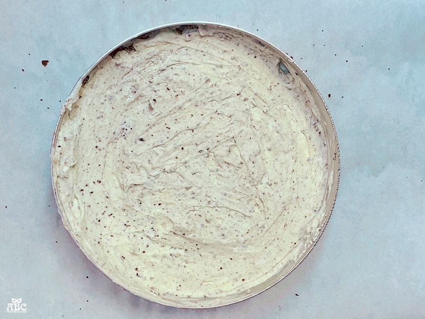 (4) 把剛剛冷凍定型好的餅乾底拿出來,倒入上面步驟混和好的部分。頂部可以用湯匙底部抹平。