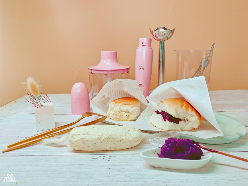 今天的粉紅少女心下午茶套餐,我們要來挑戰的有:奶油餐包兩種抹醬口味,義式蒜香奶油、甜蜜紫薯泥,一甜一鹹的口味,還有「不用烤箱」,只需要這組【BRUNO】手持式四件組攪拌棒,就能完成的Oreo起司蛋糕。