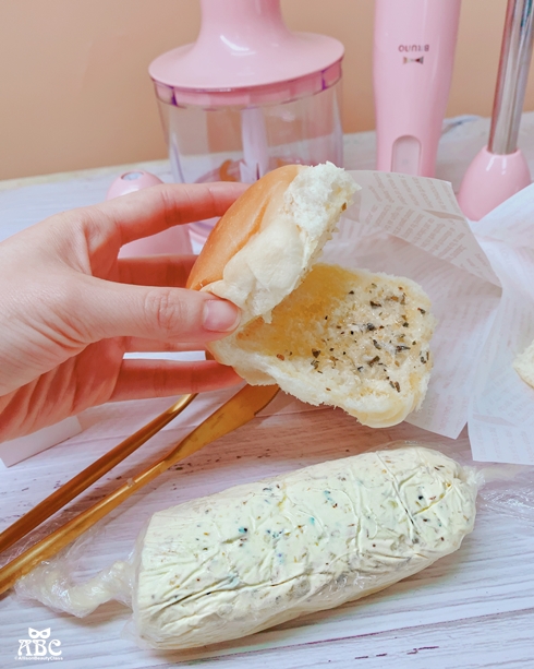我覺得義式蒜香奶油抹醬最適合搭配餐包了,把餐包切開夾一片去烤箱烤一下,根本就是西餐廳的餐前麵包一模一樣阿!