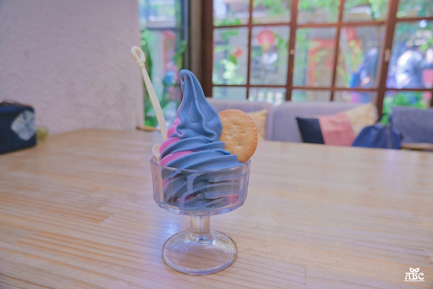 卓也小屋度假園區裡的下午茶有兩間,剛剛的書園子是位置比較高的二店,另外一間是離入口處不遠的藍庄咖啡。點了鹹口味的烤餅、飲料,還有招牌染色冰淇淋,下圖合照的冰淇淋被我偷吃了,哈。當天去的時候麻糬已經賣完好可惜,希望下次有機會吃到。