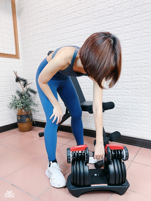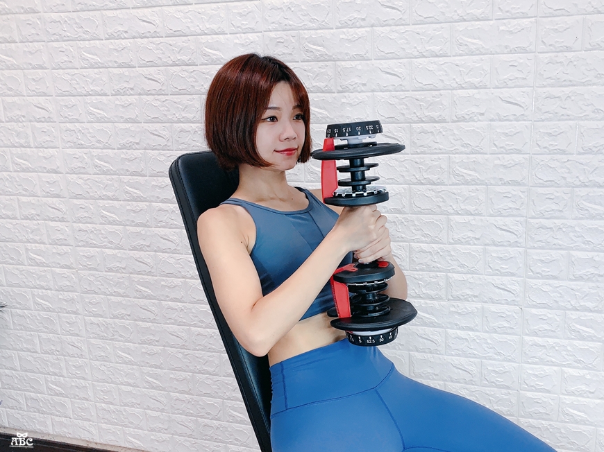 然後就這樣從中間直接拿起來,舉起就練真的太方便!尤其是做全身運動的時候,我們身體每個部位的肌力一定不同,比如我就是上身力量薄弱,下肢比較發達,啞鈴要換來換去的話就要停下來,不然就是要備好幾種不同重量在家裡,這個相較之下不佔空間,又可以秒速更換重量,真的很有效率!