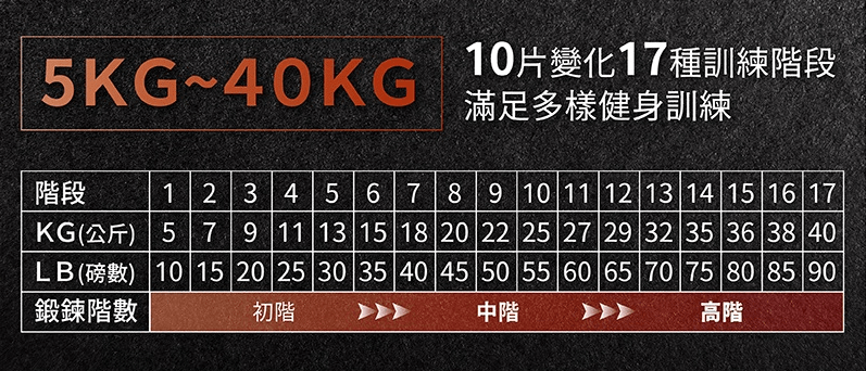 我上面動作所使用的是15段24公斤版本的,另外也有像下圖是17段,重量有到40公斤的,這個就是我弟在用的,建議女生可以用24公斤版,男生有運動基礎可以挑戰40公斤。