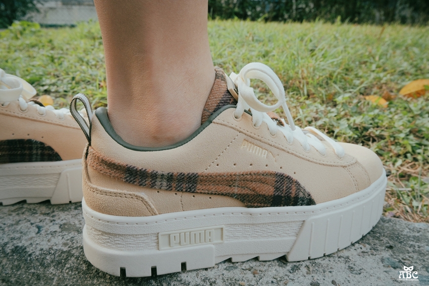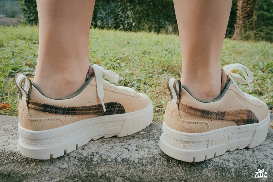 貼心的小幫手還幫我搭配了一樣是奶茶色主題的新款厚底鞋,Mayze Wns Flannel 流行休閒鞋。這雙是奶茶色麂皮材質,搭配格紋圖樣的彎刀設計,融合學院甜美又帶有個性感。