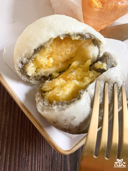 黑芝麻與牛奶的黑白雙色麵皮,內餡是鹹蛋黃口味的奶酥喔!