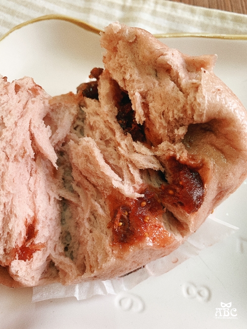 撥開讓你們看一下內層的蔓越莓果乾,我喜歡撕下一片片饅頭來吃,在嘴裡咀嚼很久,幸福感也持續很久。