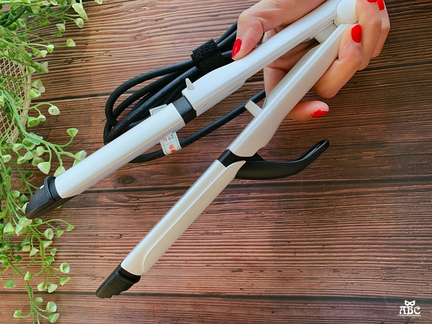 使用捲髮棒功能的時候,可以一手壓住頂端的輔助版,幫助面板密合效果更好,這樣捲出來效果會更明顯。(黑色部分是防燙的)