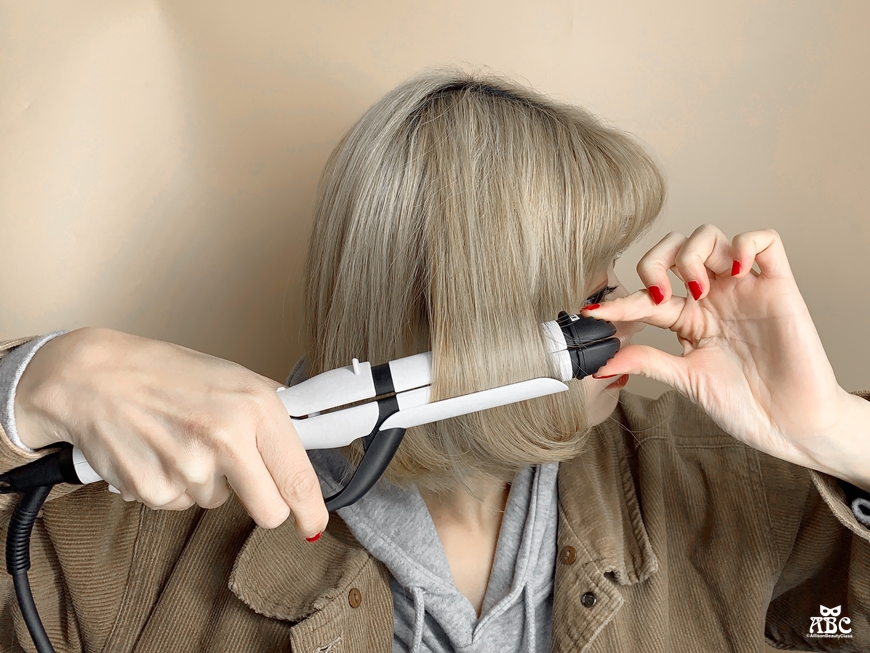 接下來切換到直髮夾功能,我們把髮束挑出來外捲,雖然一樣是外捲,但是跟捲髮棒的效果就不太一樣,屬於線條比較明顯的風格,帶有率性感的韓國歐膩髮型。