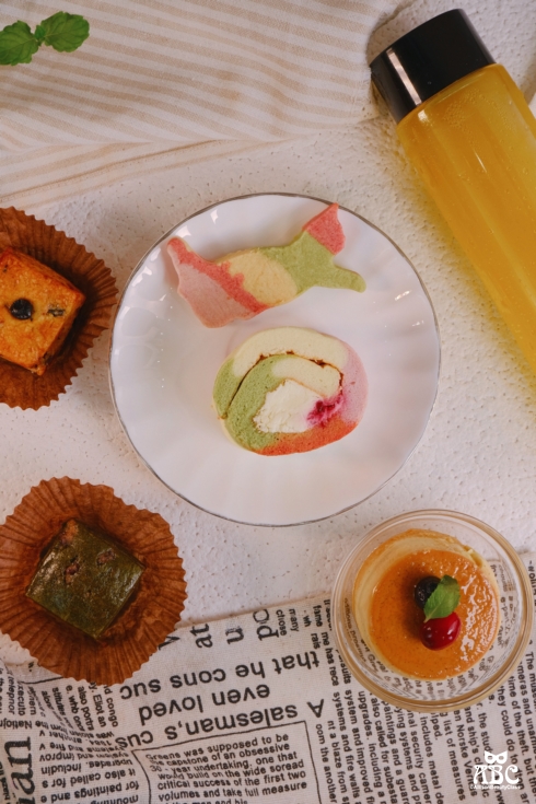 目前下午茶套餐是固定品項,內容有兩個司康(當日口味任選)、彩虹蛋糕捲、焦糖布丁蛋糕,及任選飲料一杯。