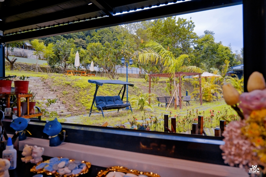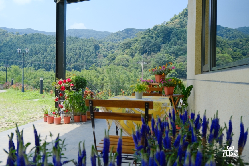 停好車後需要走一段長梯,走上來後你會發現超美的山景就在眼前,咖啡廳門口佈置的小花園很溫馨。