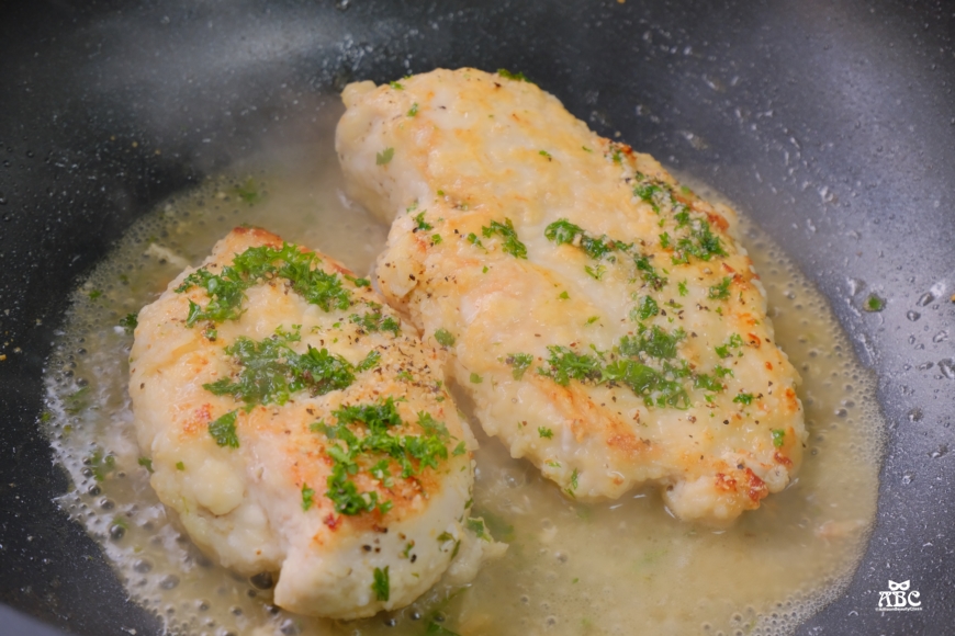 4. 開蓋翻面,確認兩面金黃色後,淋上檸檬汁、高湯,撒上香料及調味料提味,巴西里、香蒜粉、黑胡椒。小火煮4分鐘左右,等湯汁收差不多就可以起鍋擺盤完成!