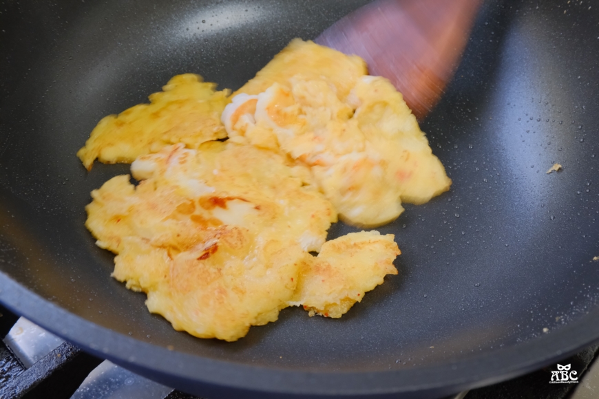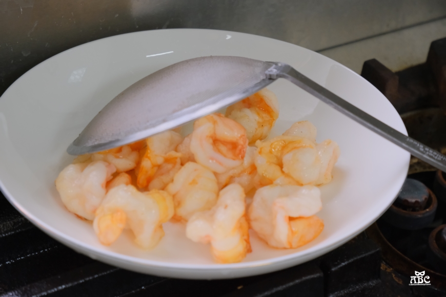 3. 油鍋熱後蝦仁下去油炸至變色撈起備用