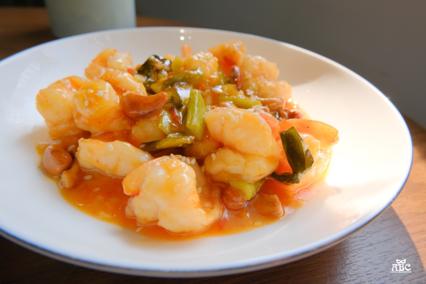 4. 倒掉多餘的油,鍋內只需一點點油,蒜末、蔥段下去炒香,接著腰果下去翻炒,再倒入糖醋醬汁,下蝦仁,一邊翻炒醬汁裹上蝦仁,醬汁變濃稠就可以起鍋了。起鍋前可以撒上白芝麻點綴。