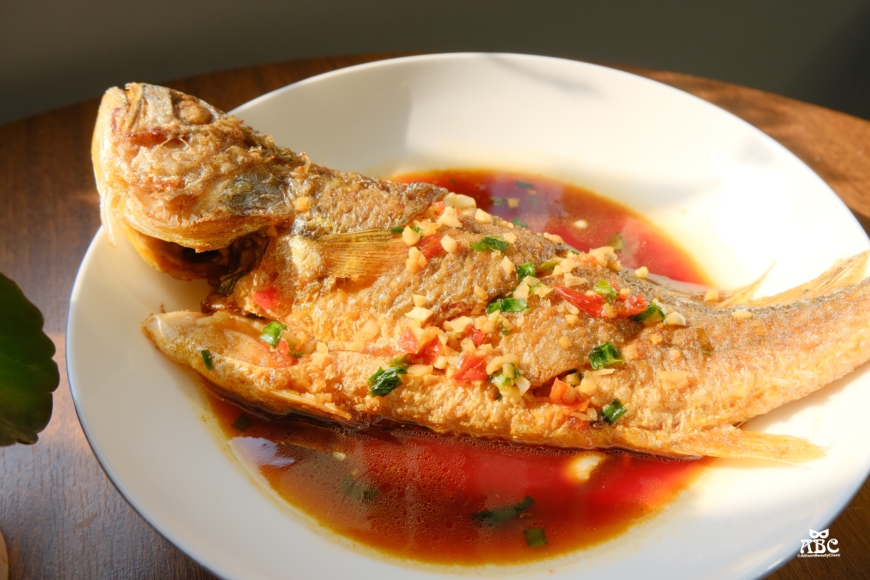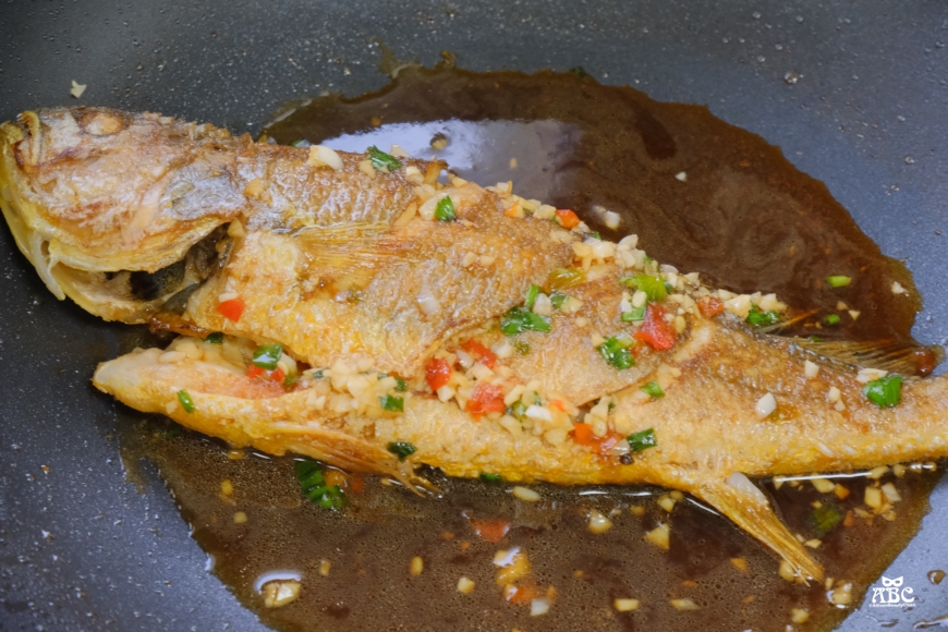 5. 倒入醬汁(醬油、味淋、開水,我是1:1:1調配,大家可以依個人口味調整)、放入蒜末、蔥末、辣椒末,澆淋醬汁在魚的表面,小火等收汁差不多就起鍋完成。