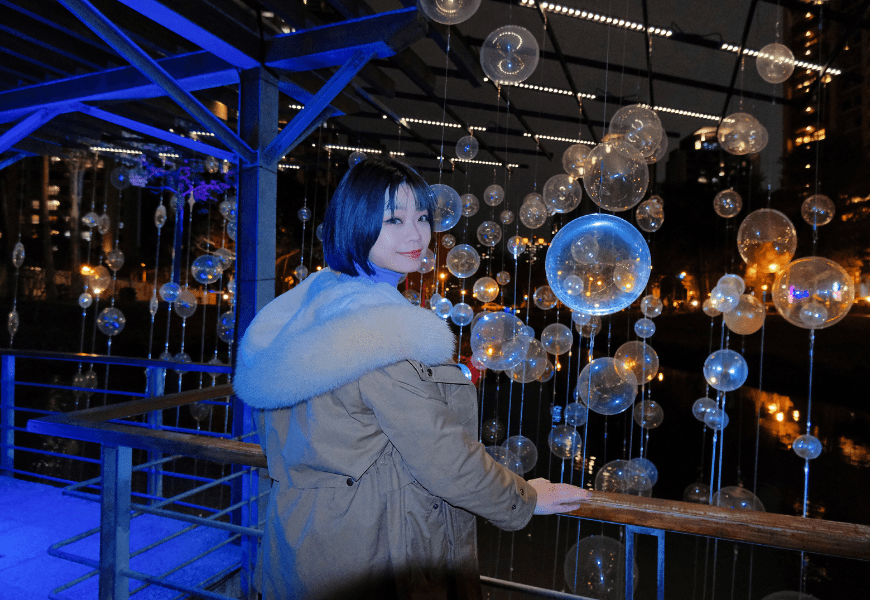 走近觀看大小錯落的雨滴,又像泡泡般夢幻。從遠到近觀看,各有不同的視覺效果。