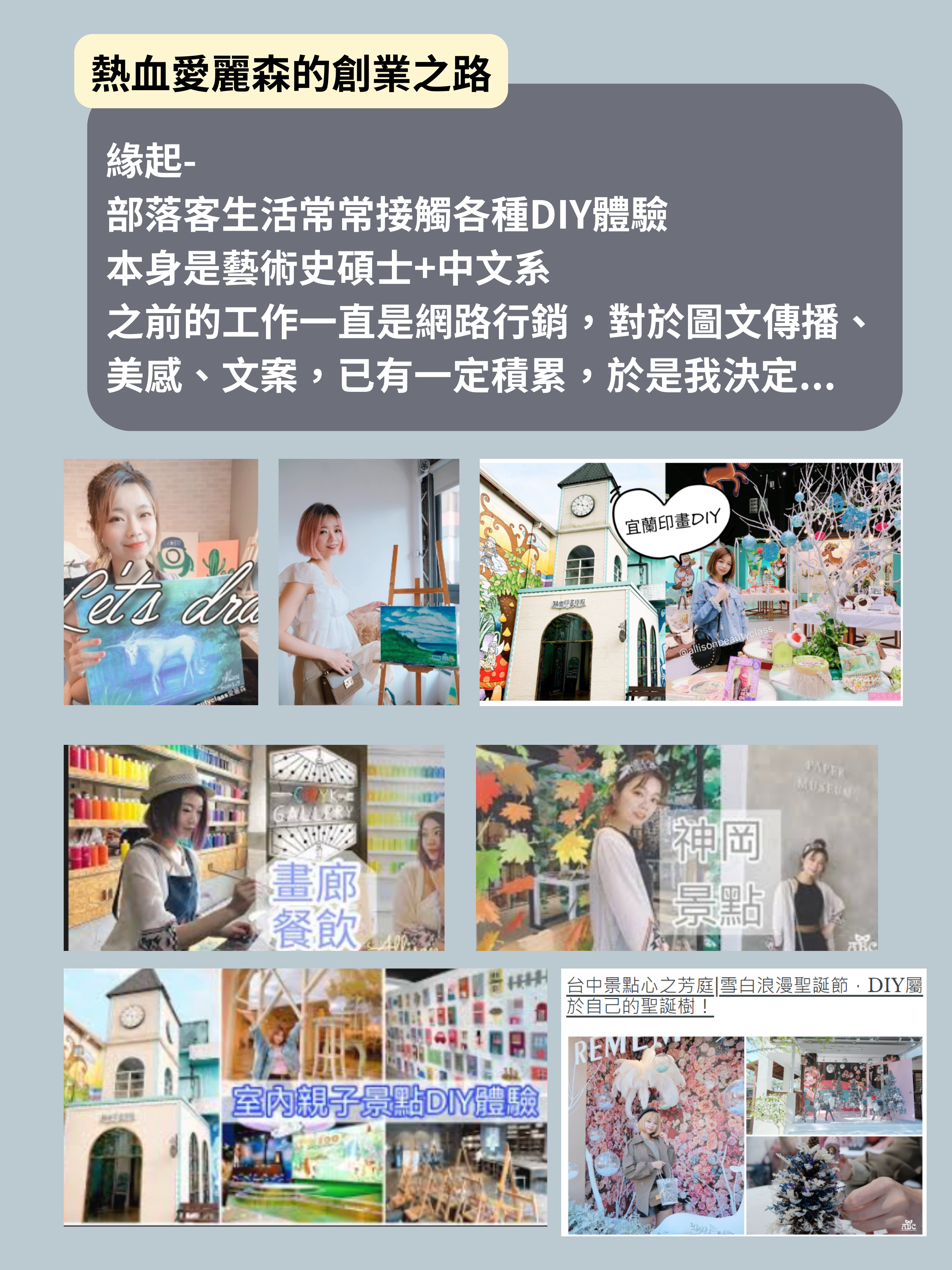 師大藝術史碩士,歷經電商行銷、自媒體部落客、烘焙、DIY手作,10年後重返藝術懷抱的素人自學畫家,愛麗森。