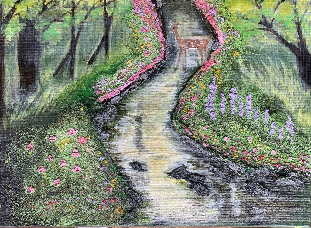 此幅《尋路》是第3幅,沿著瀑布而下,有隻小鹿正在涉水,牠似乎正往左邊的大樹前進,那裡會出現什麼樣的驚喜呢?