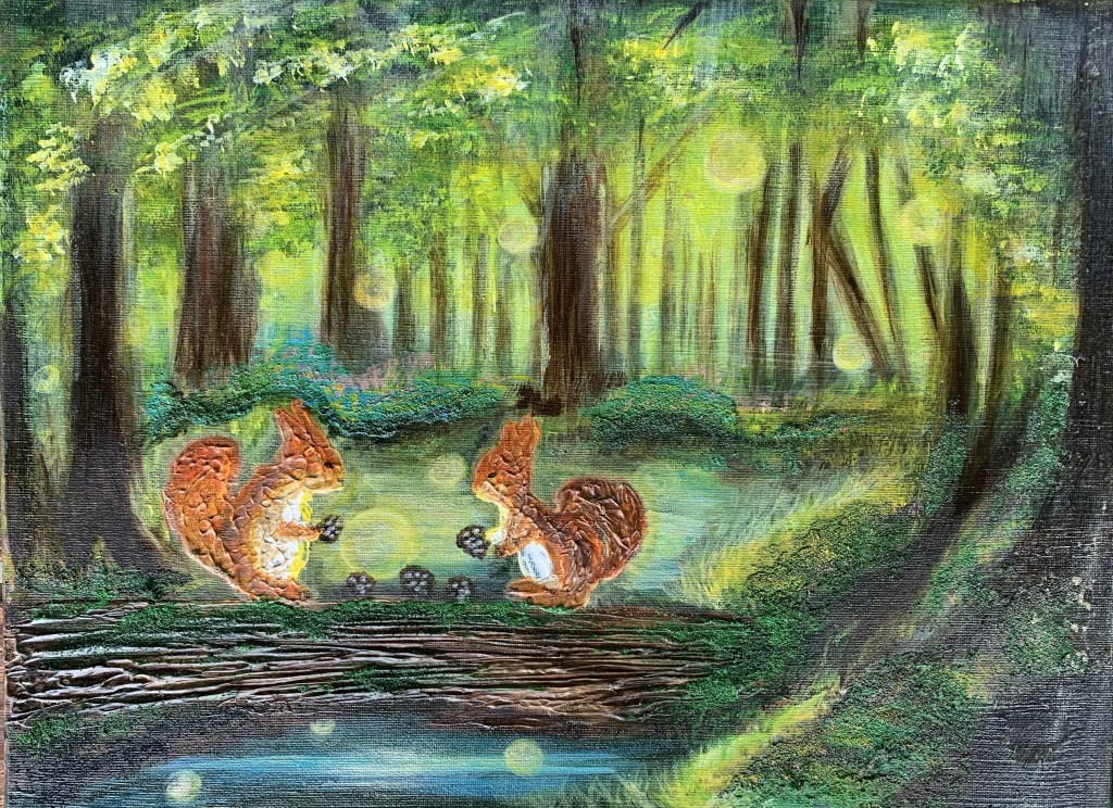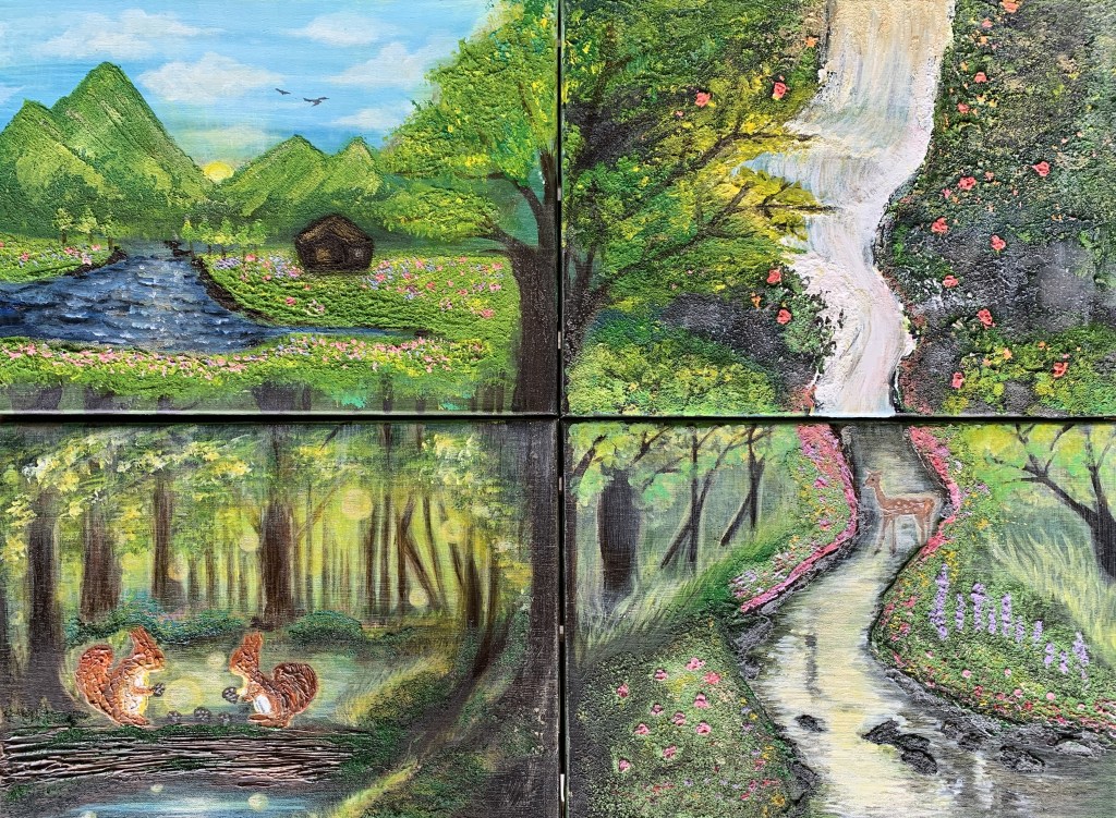 此系列共4幅作品,創作概念是可以拼接的立體繪本故事(以複合媒材打造立體感),每幅可分開獨立,也可合併為一個整體畫面。四幅合併中央是森林中的巨樹,串聯童話森林的中心。靈感來源是小時候特別愛看故事繪本,每次翻頁的時候,總會忘了上個場景再翻回去看,於是思考如果故事情節畫面能夠彼此相連,也許會更有情境帶入感,也增加賞畫的樂趣。